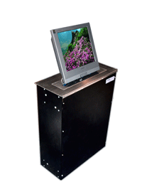 本公司生產的液晶屏升降器主要應用于大型會議室,高級多媒體網絡系統,當需要舉行會議時隱藏在會議桌內的升降機把顯示屏從會議桌下面自動升到桌面并仰成一成角度,符合人機工程學原理,產品也可以左右調節角度,更有利于辦公演示的需要,當不使用時顯示屏可自動下降隱藏于會議桌內部,并自動關門,產品具有防盜、防塵保持桌面平整,美化桌面等功能。最新研制生產的同步帶傳輸液晶顯示屏升降器,克服了鏈條、和齒條升降器的噪音大、油污多、傳動不穩定等缺點,是目前國內最新液晶屏升降器的傳動方式。